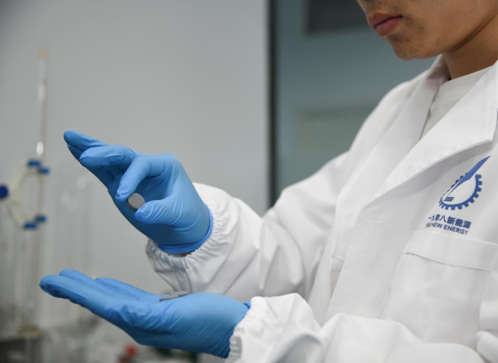 西安一九零八新能源科技有限公司科研人員在展示由其研發(fā)的復(fù)雜金屬基復(fù)合固態(tài)儲氫材料。新華社記者 張博文 攝