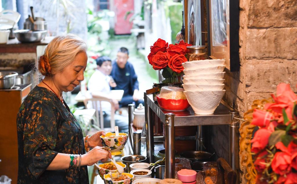 現(xiàn)在周英碧在山城巷經(jīng)營著一家小吃店,旺季時每天能接待上百個客人。她最喜歡的事就是閑時和游客“擺擺龍門陣”,給他們講一講山城巷的故事。