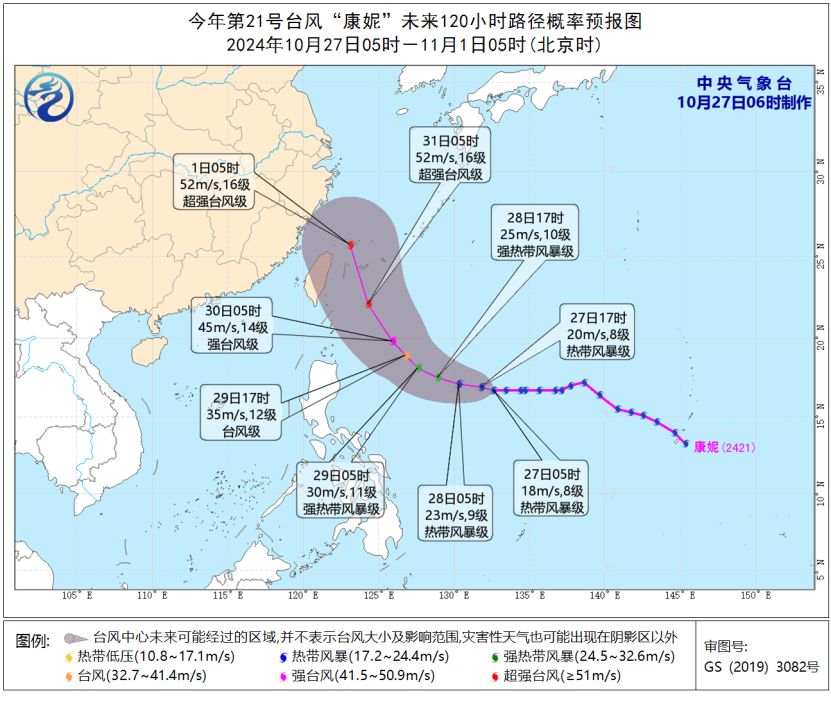 預(yù)計(jì),“康妮”將以每小時(shí)10至15公里的速度向偏西方向移動(dòng)。29日開始轉(zhuǎn)向西北方向移動(dòng),逐漸向臺(tái)灣島東部海面靠近,強(qiáng)度逐漸增強(qiáng),最強(qiáng)可達(dá)強(qiáng)臺(tái)風(fēng)級(jí)或超強(qiáng)臺(tái)風(fēng)級(jí)(48至55米/秒,15至16級(jí))。