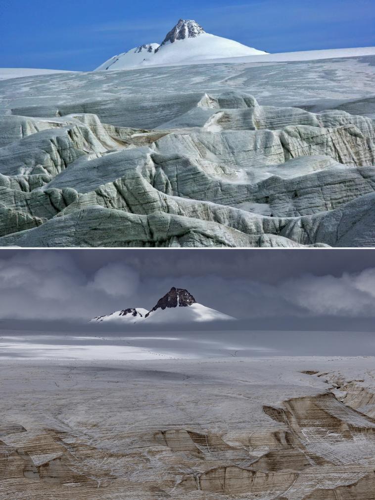 拼版照片:上圖為2009年6月拍攝的普若崗日主峰(新華社發(fā) 車剛攝);下圖為2024年9月4日拍攝的普若崗日主峰(新華社記者姜帆攝)。對比可以看出普若崗日主峰下的冰原消融嚴(yán)重。新華社發(fā)