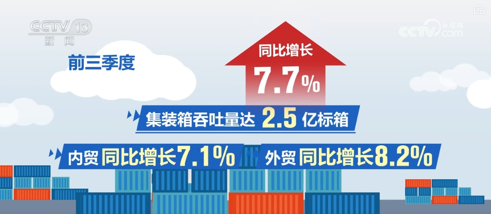 前三季度,全國港口貨物吞吐量129.7億噸,同比增長3.4%。其中,內(nèi)貿(mào)、外貿(mào)同比分別增長1.7%和7.6%。集裝箱吞吐量達2.5億標(biāo)箱,同比增長7.7%。其中,內(nèi)貿(mào)、外貿(mào)同比分別增長7.1%和8.2%。