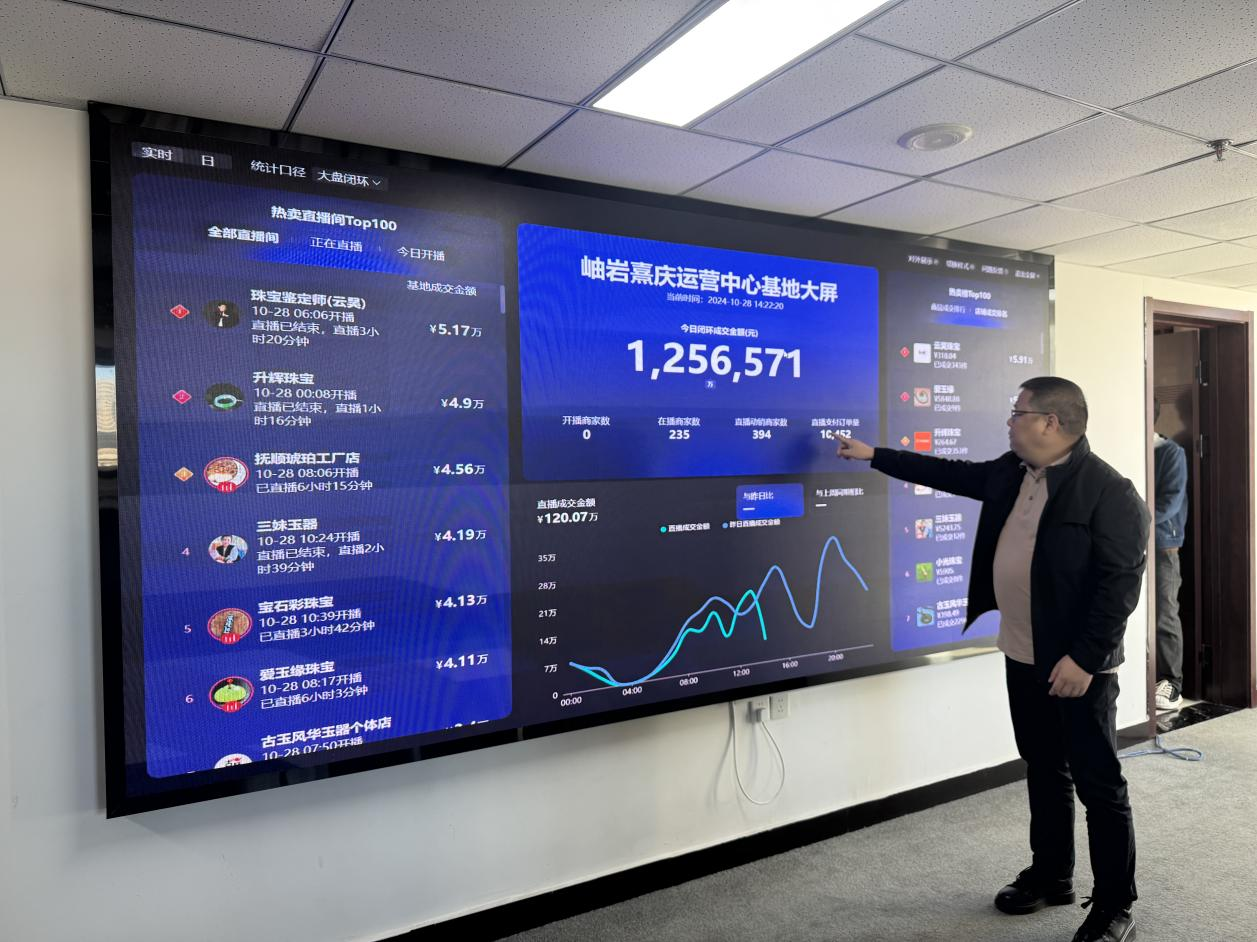 “1256571元,這是我們一上午的交易額”,岫巖熹慶運(yùn)營(yíng)中心的負(fù)責(zé)人指著墻上的大屏幕說(shuō):“通過(guò)這塊屏幕,不僅能實(shí)時(shí)看到各家商戶的開播、交易情況,還可以通過(guò)數(shù)據(jù)的波動(dòng)及時(shí)發(fā)現(xiàn)存在的問(wèn)題?!?/p>