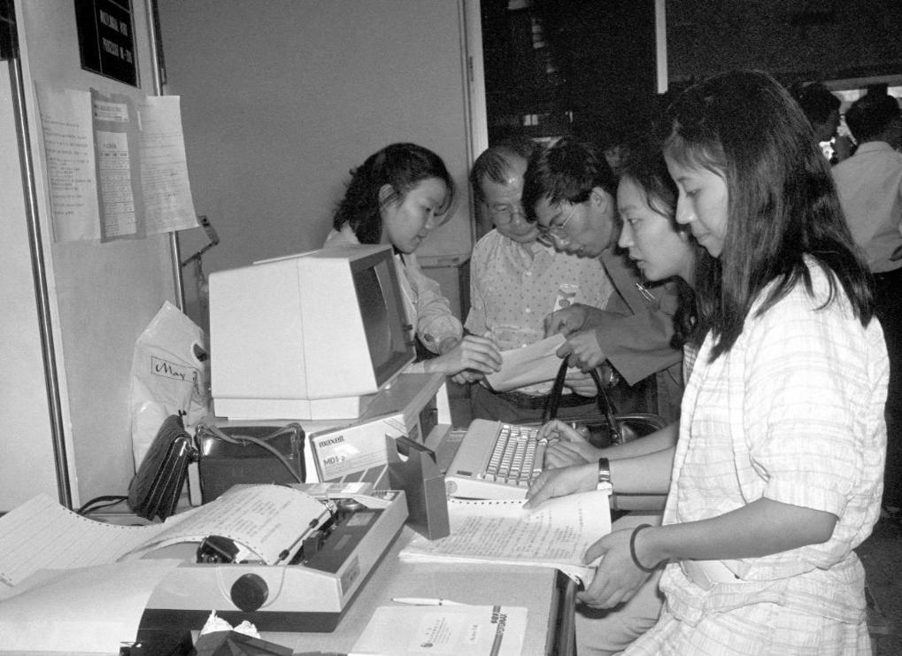 1991年3月,在上海舉行的首屆華東出口商品交易會(后發(fā)展為華東進出口商品交易會,簡稱“華交會”)上,兩名意大利客商同浙江省輕工業(yè)品進出口公司代表洽談業(yè)務(wù)。新華社記者 柳中央 攝