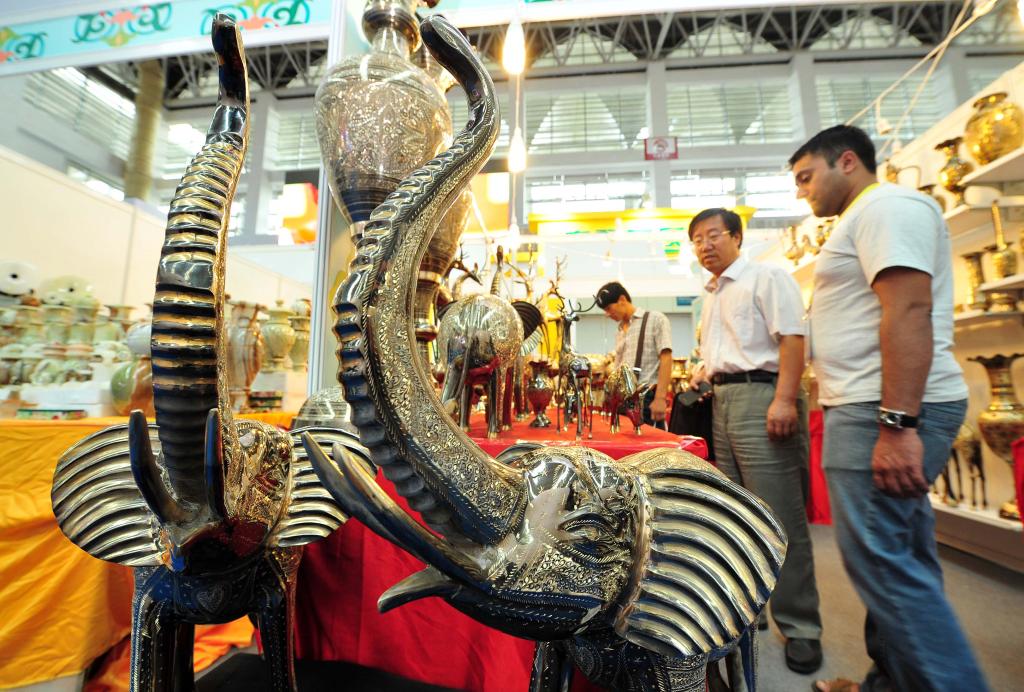 2013年9月15日,在寧夏銀川舉行的首屆中國-阿拉伯國家博覽會上,觀展者咨詢選購巴基斯坦展區(qū)的特色展品黃銅雕塑。