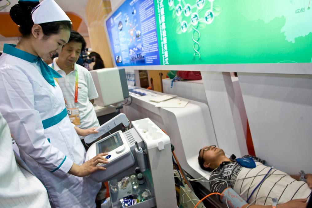 2012年5月28日,觀眾在首屆中國(北京)國際服務(wù)貿(mào)易交易會(簡稱“京交會”,后發(fā)展為中國國際服務(wù)貿(mào)易交易會,即“服貿(mào)會”)體驗全方位健康體檢。新華社發(fā)(趙冰 攝)