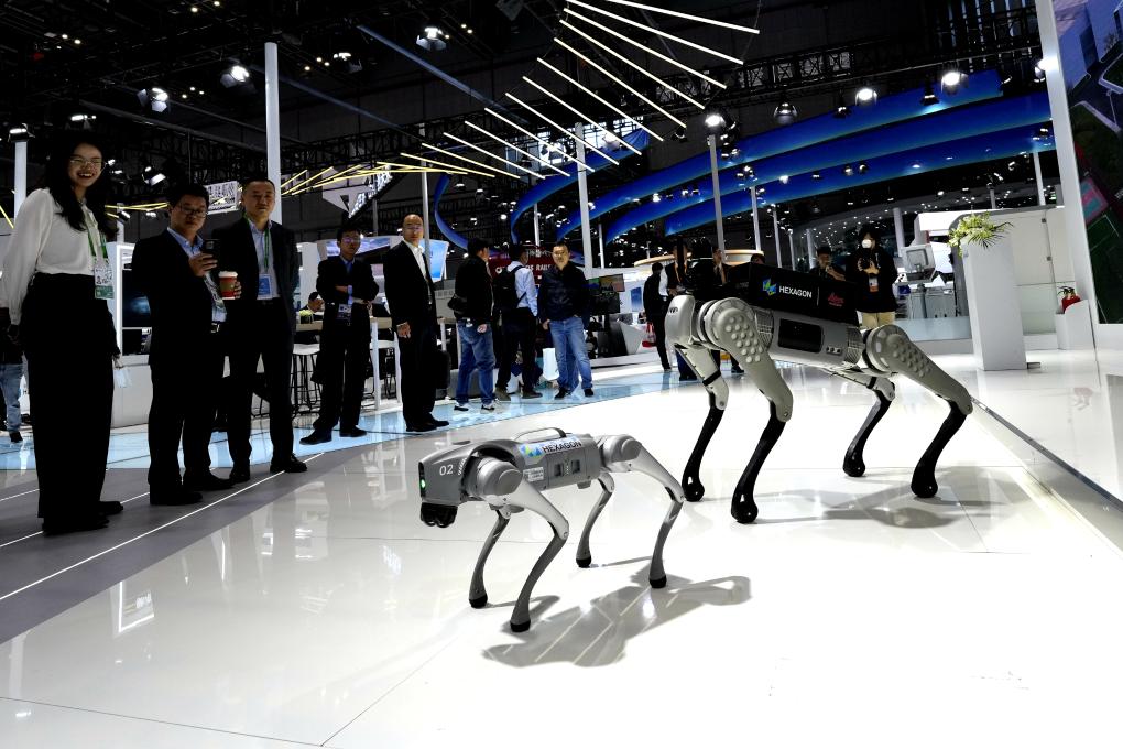 2023年11月7日,觀眾在第六屆進博會技術(shù)裝備展區(qū)觀看智能機器狗。新華社記者 張建松 攝