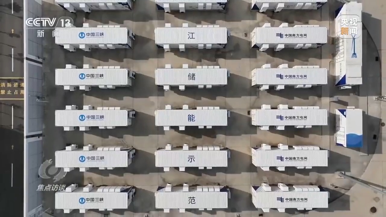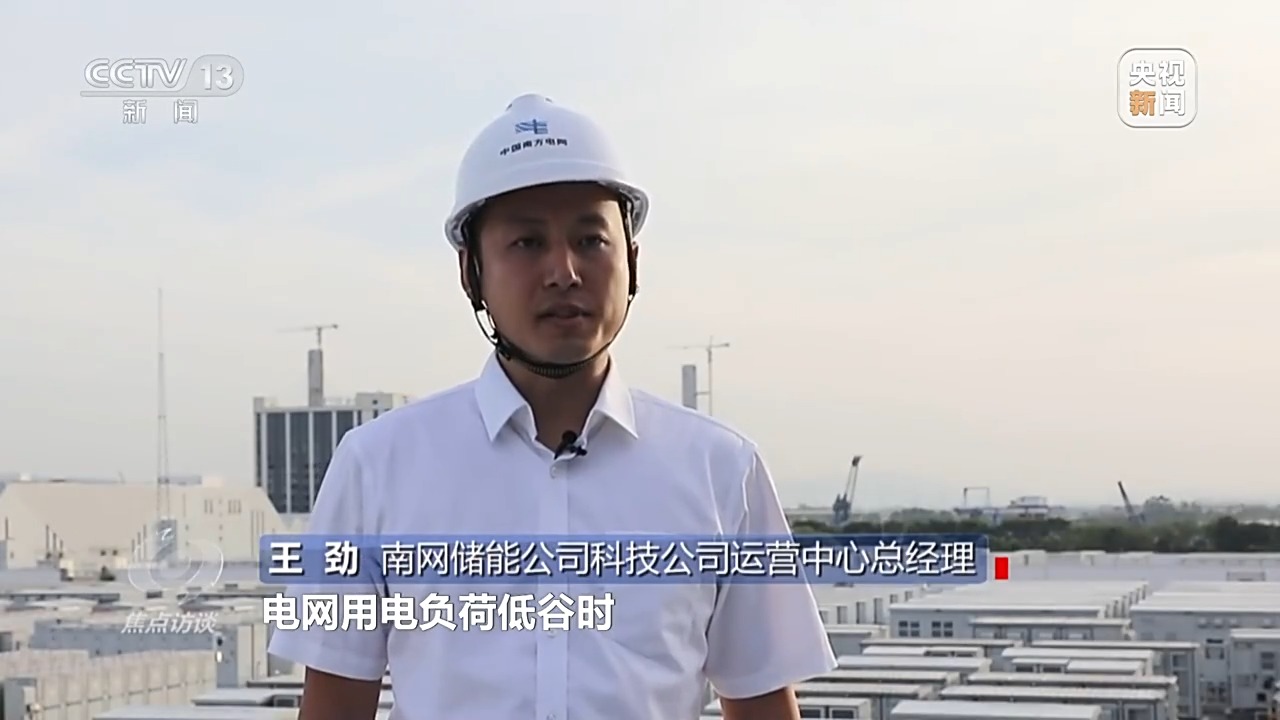 南網(wǎng)儲能公司科技公司運營中心總經理 王勁:電網(wǎng)用電負荷低谷時,把電廠發(fā)出的多余的電儲存到250個電池儲能柜內,用電高峰時,把電池儲能柜里的電能釋放出來支持電網(wǎng)的電力供應。