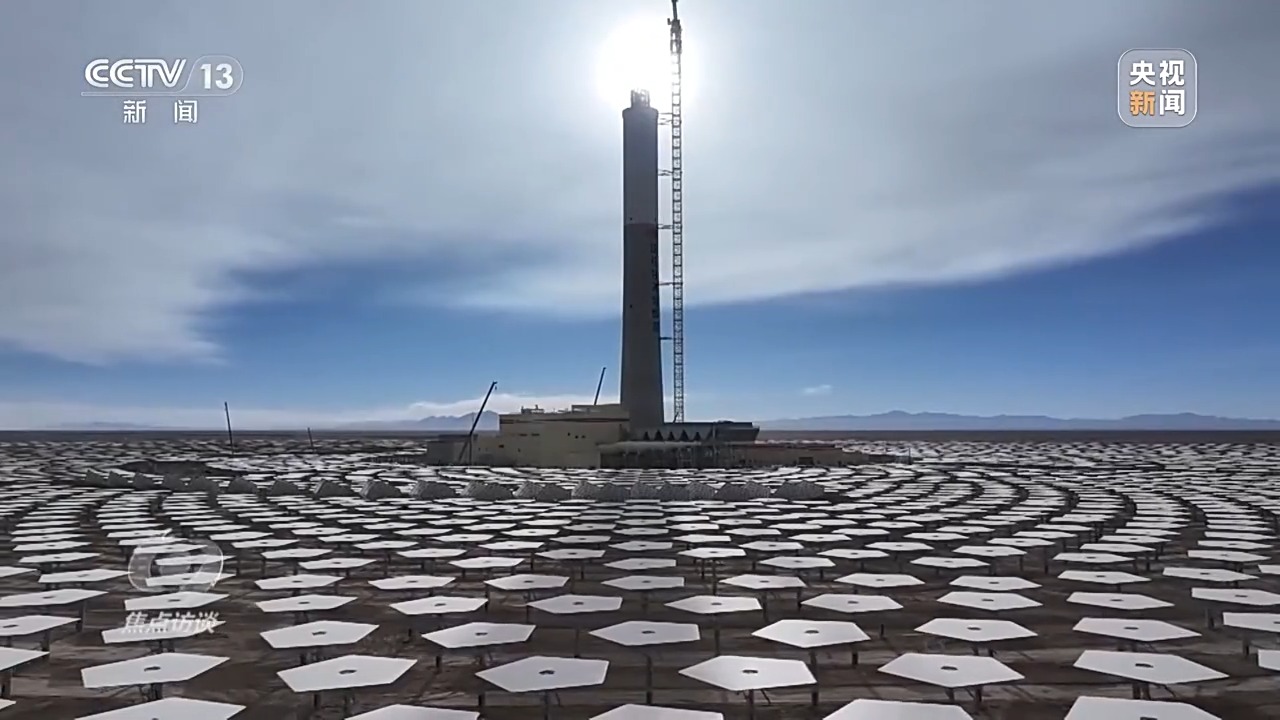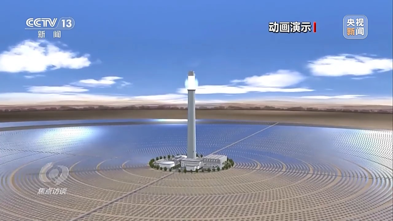 電站通過高精度智能定日鏡,實時跟蹤太陽的運動,將太陽直接輻射光反射聚集到吸熱塔上,將吸熱塔內的熔鹽加熱到560多℃的高溫,將高溫的熔鹽進行儲存,在需要發(fā)電時再通過高溫熔鹽與水進行熱交換,產生高溫高壓的蒸汽,驅動汽輪發(fā)電機組發(fā)電。
