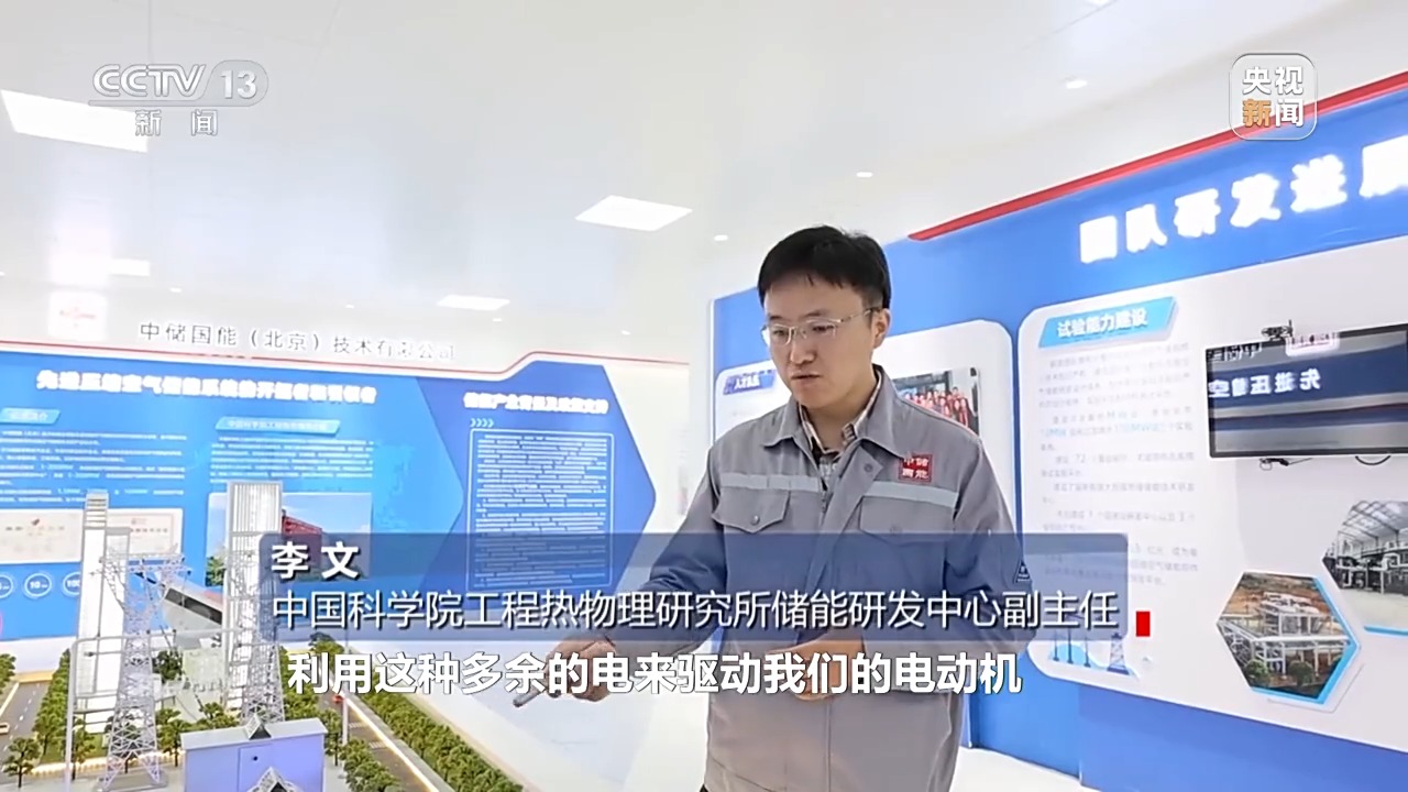 中國科學院工程熱物理研究所儲能研發(fā)中心副主任 李文:利用多余的電來驅動電動機,帶動壓縮機把空氣壓縮到高壓狀態(tài),最后存儲到儲氣裝置中,在有需要的時候,我們利用所存儲的高壓空氣來驅動膨脹機,帶動發(fā)電機進行做功發(fā)電。