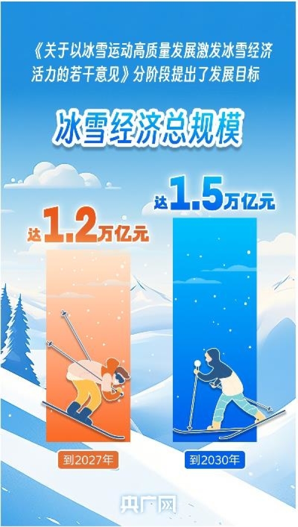 近日,國務院辦公廳公開發(fā)布《關(guān)于以冰雪運動高質(zhì)量發(fā)展激發(fā)冰雪經(jīng)濟活力的若干意見》(以下簡稱《意見》),分階段提出發(fā)展目標:到2027年,冰雪運動場地設施更加完善,服務水平顯著提升,冰雪運動更加廣泛開展,冰雪經(jīng)濟總規(guī)模達1.2萬億元。到2030年,冰雪經(jīng)濟主要產(chǎn)業(yè)鏈條實現(xiàn)高水平協(xié)調(diào)融合發(fā)展,冰雪消費成為擴大內(nèi)需的重要增長點,冰雪經(jīng)濟總規(guī)模達1.5萬億元。