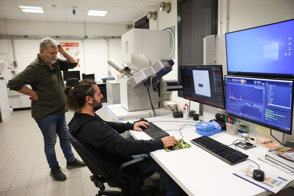 11月6日,意大利帕多瓦大學(xué)文化遺產(chǎn)學(xué)院教授馬西莫·維達(dá)萊(左)與研究人員在實(shí)驗(yàn)室討論青銅獅樣本檢測(cè)分析過(guò)程。新華社記者李京攝