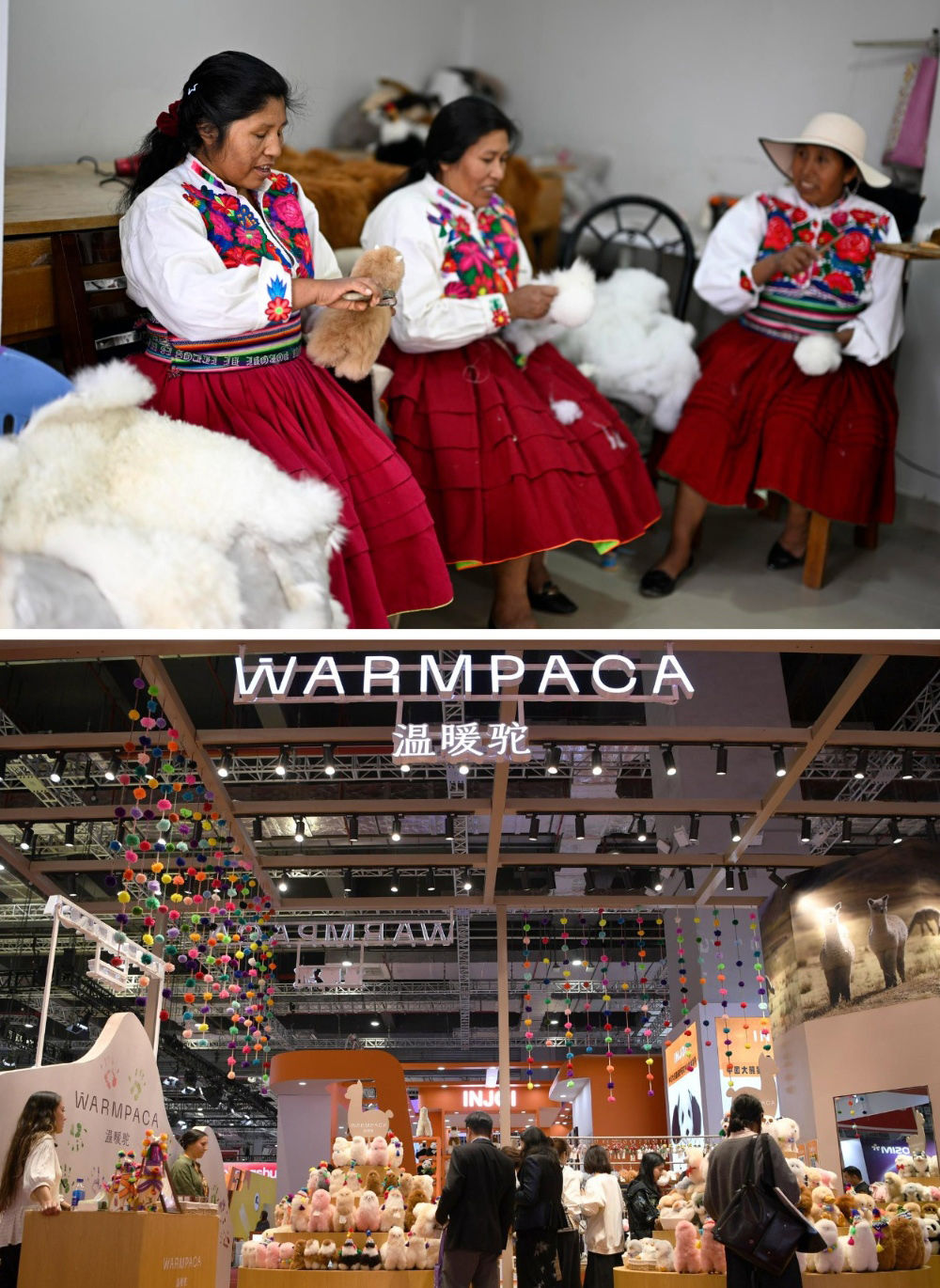 2016年,中國姑娘馬玉霞在秘魯阿雷基帕街邊市場購買了秘魯羊駝毛制品手工藝人奧斯瓦爾多·馬馬尼的羊駝毛玩偶并引入中國市場。通過連續(xù)參展進博會,羊駝毛制品在中國市場大受歡迎,并創(chuàng)立了中文品牌“溫暖駝”。今年,秘魯品牌“溫暖駝”連續(xù)第七年亮相進博會,受到更多中國消費者的喜愛。目前,“溫暖駝”品牌已入駐國內30多家商場,并且開拓了電商平臺線上銷售,年銷量超過3萬只。上圖:2024年6月20日,在秘魯阿雷基帕,工作人員在羊駝毛制品手工藝人奧斯瓦爾多·馬馬尼的工坊制作羊駝玩偶。下圖:2024年11月5日在上海拍攝的第七屆進博會秘魯“溫暖駝”展臺。