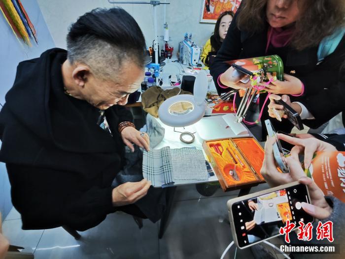 不足十平方米的店鋪中,老師傅徐春元桌前靜坐,目光如炬,手腕翻飛,細(xì)如牛毛的針在布料中來(lái)回穿梭。已年過(guò)花甲的他,從事織補(bǔ)工作整整48年,是“傳統(tǒng)精工織補(bǔ)技藝”非遺項(xiàng)目持有人。那雙巧手,總能將破損的衣物修復(fù)得如初見(jiàn)般完美。
