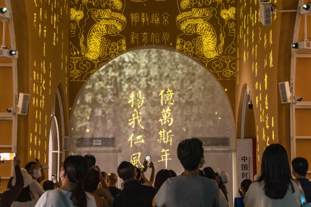 作為北京中軸線15處遺產(chǎn)構(gòu)成要素之一,鐘鼓樓于2019年啟動文物修繕及展示提升工作,該工作被納入《北京中軸線申遺保護三年行動計劃》。記者步入鼓樓一層,各券洞相互連通、明亮開敞。徜徉其中,展覽“時間的故事”回溯著鐘鼓樓和北京中軸線保護傳承的故事。忽見遮光簾落下、光影秀開場,觀眾皆循響起的音樂匯聚到展廳中央,或舉起相機,或靜靜欣賞。吊裝在兩旁白色拱形鋼結(jié)構(gòu)下的投影儀投射出萬道光線,讓觀眾在光影變幻間走進那段“暮鼓晨鐘”的歷史記憶。