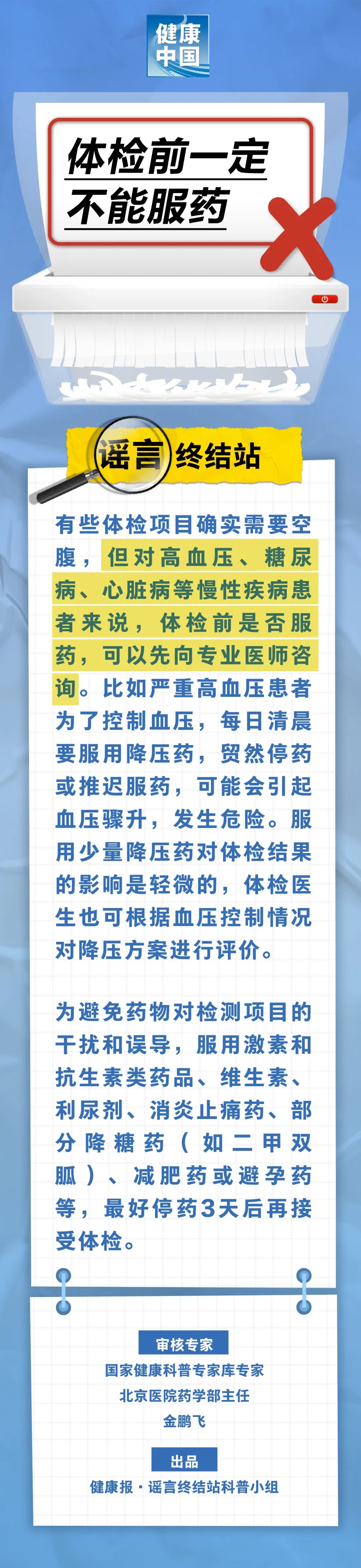 體檢前是否服藥要根據(jù)服用的藥物和檢查目的而定。比如,降壓藥可以按照正常服藥時(shí)間服完后再進(jìn)行體檢,避免造成血壓波動(dòng)過大,還可同時(shí)評(píng)估降壓藥物的治療效果;而有些需要隨餐服用的降糖藥則不應(yīng)空腹服用,一般建議隨身攜帶降糖藥,待完成空腹項(xiàng)目后進(jìn)餐時(shí)服用,這樣既保證了服藥效果,又檢測(cè)了真實(shí)的空腹血糖。