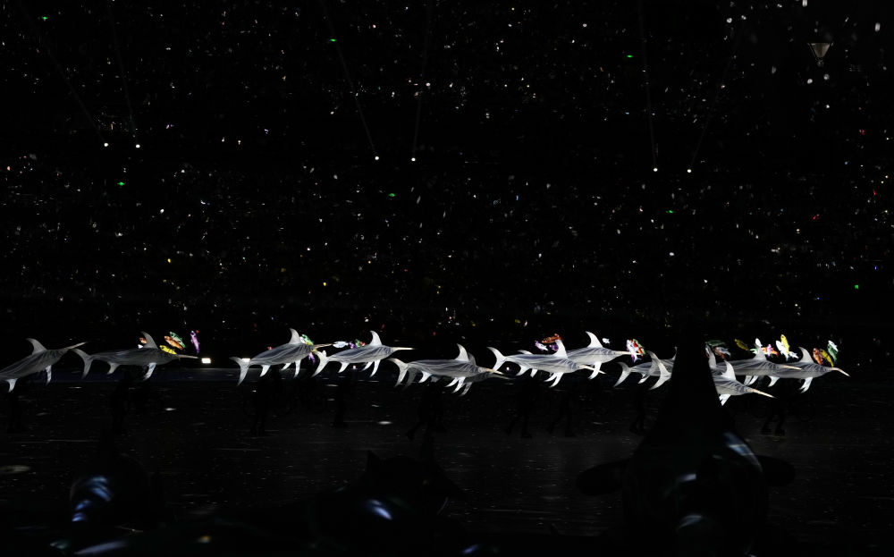 在全場觀眾“哇”的一聲驚嘆中,整座體育場化身星辰大海。騎自行車、滑輪滑、腳踩平衡車的演員們手舉海龜、鯊魚、海豚等形象魚貫而入,讓觀眾如置海底。隨后,高鐵飛馳、深海探測、火箭發(fā)射、太空行走等畫面在星海中逐一呈現,展現了我國在高科技領域的發(fā)展成就,帶來生動的沉浸式體驗。