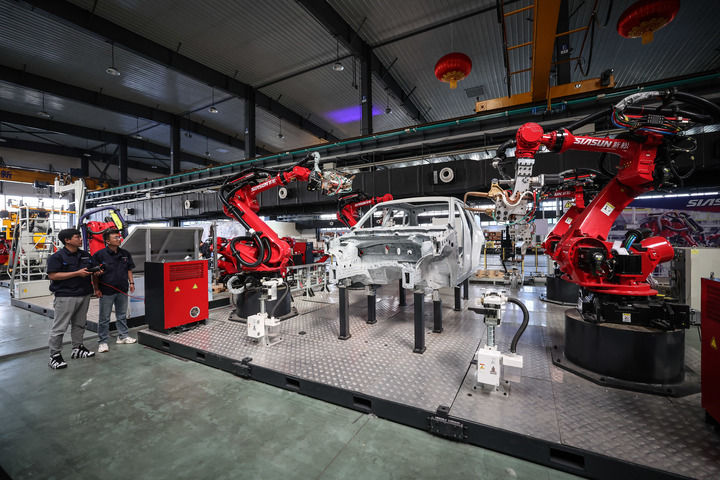 2024年6月3日,沈陽新松機器人自動化股份有限公司的機器人研發(fā)工程師在測試驗證為點焊機器人新開發(fā)的功能。新華社記者 潘昱龍 攝