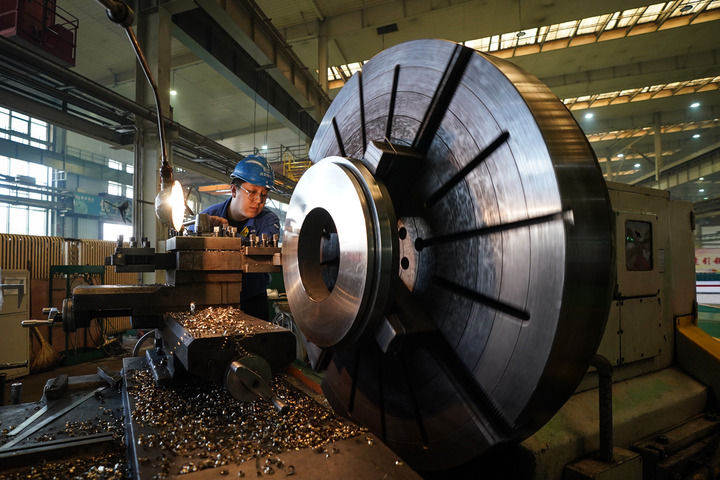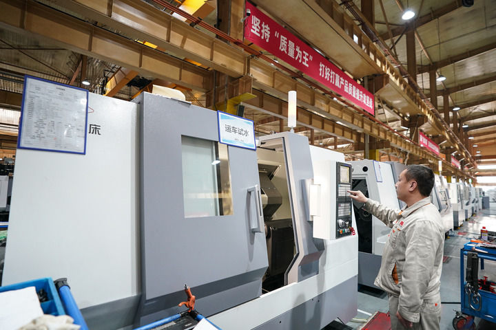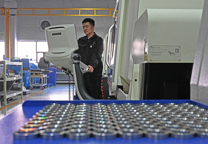 2024年3月21日,在沈陽微控飛輪技術股份有限公司,工人在機加車間操控機床。新華社記者 楊青 攝