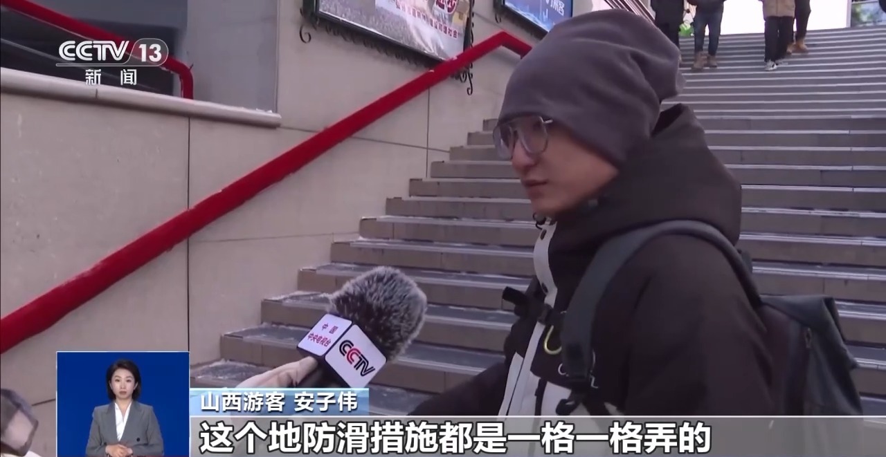 山西游客 安子偉:這個(gè)地防滑措施都是一格一格弄的,有橡膠還有鋁合金。扶手也做了一些保暖措施,不管是旅游相關(guān)人員,還是哈爾濱的市民,對我們都很熱情,東北人熱情“嘎嘎的”。