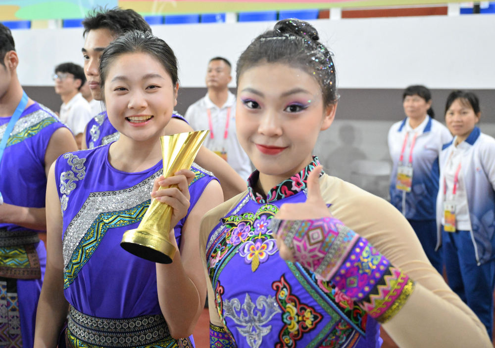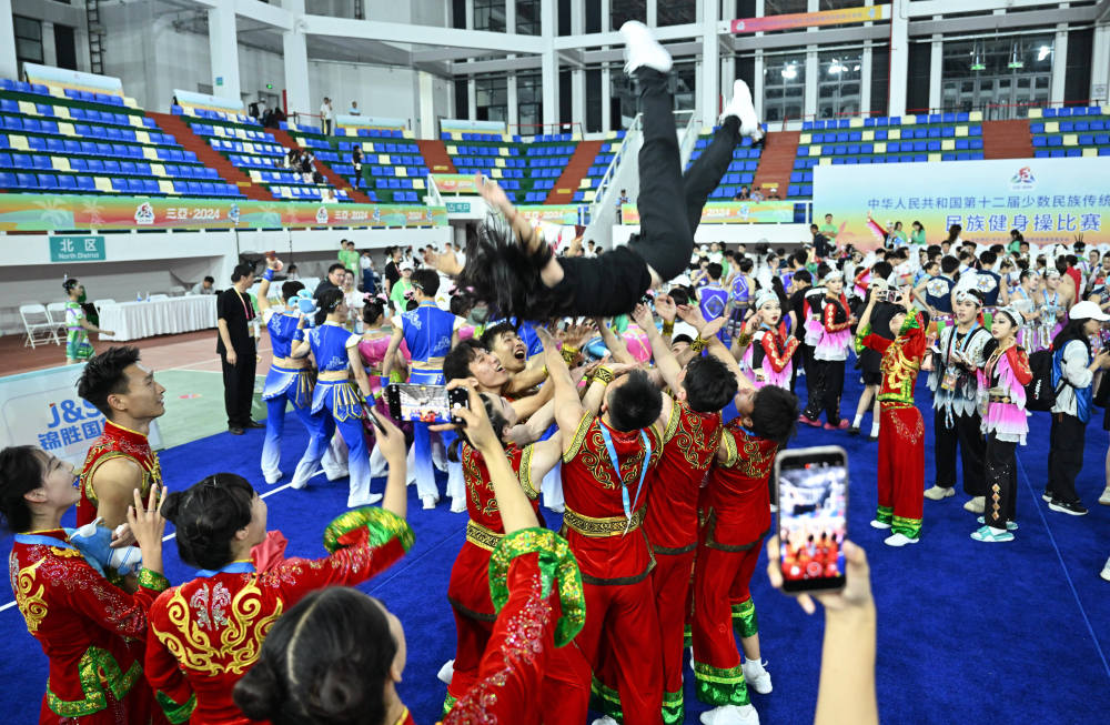 11月28日,西藏隊運(yùn)動員慶祝團(tuán)隊獲得民族健身操自選套路(輕器械)一等獎。