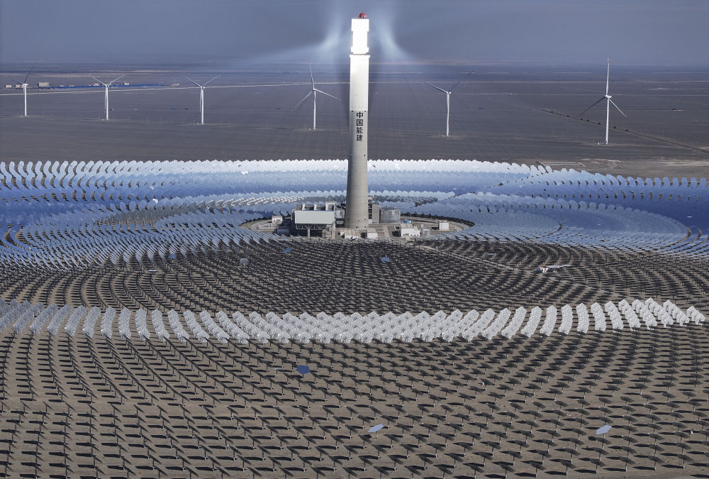 這是2024年9月12日在新疆哈密市伊吾縣淖毛湖鎮(zhèn)拍攝的國(guó)家光熱示范項(xiàng)目——熔鹽塔式50兆瓦光熱發(fā)電站(無(wú)人機(jī)照片)。新華社記者 胡虎虎 攝