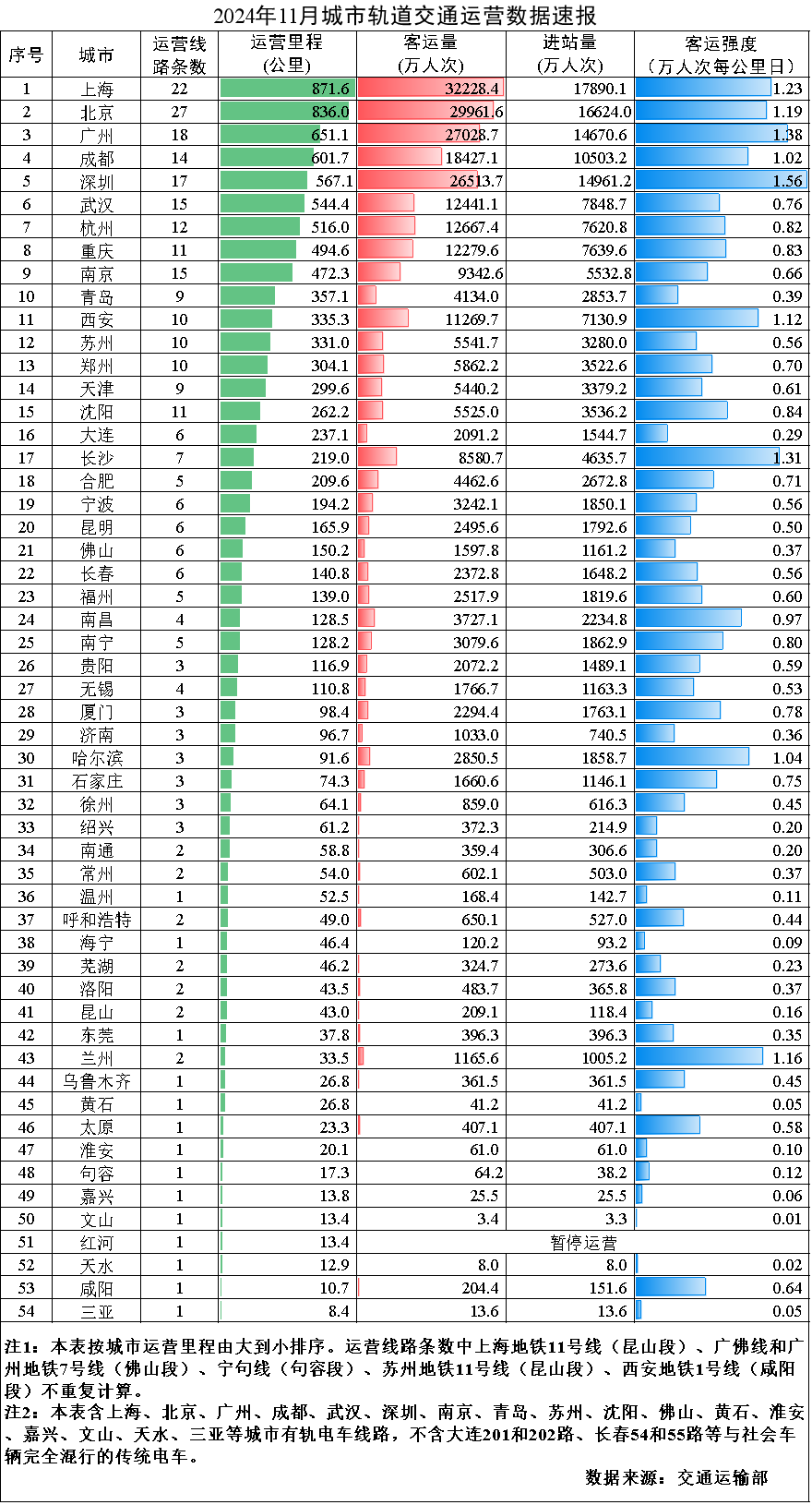 交通運(yùn)輸部發(fā)布消息,2024年11月,31個(gè)?。ㄗ灾螀^(qū)、直轄市)和新疆生產(chǎn)建設(shè)兵團(tuán)共有54個(gè)城市開通運(yùn)營(yíng)城市軌道交通線路313條,運(yùn)營(yíng)里程10522.1公里,實(shí)際開行列車340萬列次,完成客運(yùn)量27.1億人次,進(jìn)站量16.2億人次。11月份,客運(yùn)量環(huán)比減少0.6億人次,降低2.2%,同比增加1.3億人次,增長(zhǎng)5.2%。11月份全國(guó)總運(yùn)營(yíng)里程的平均客運(yùn)強(qiáng)度為0.860萬人次每公里日,環(huán)比增長(zhǎng)0.8%,同比增長(zhǎng)1.9%。
