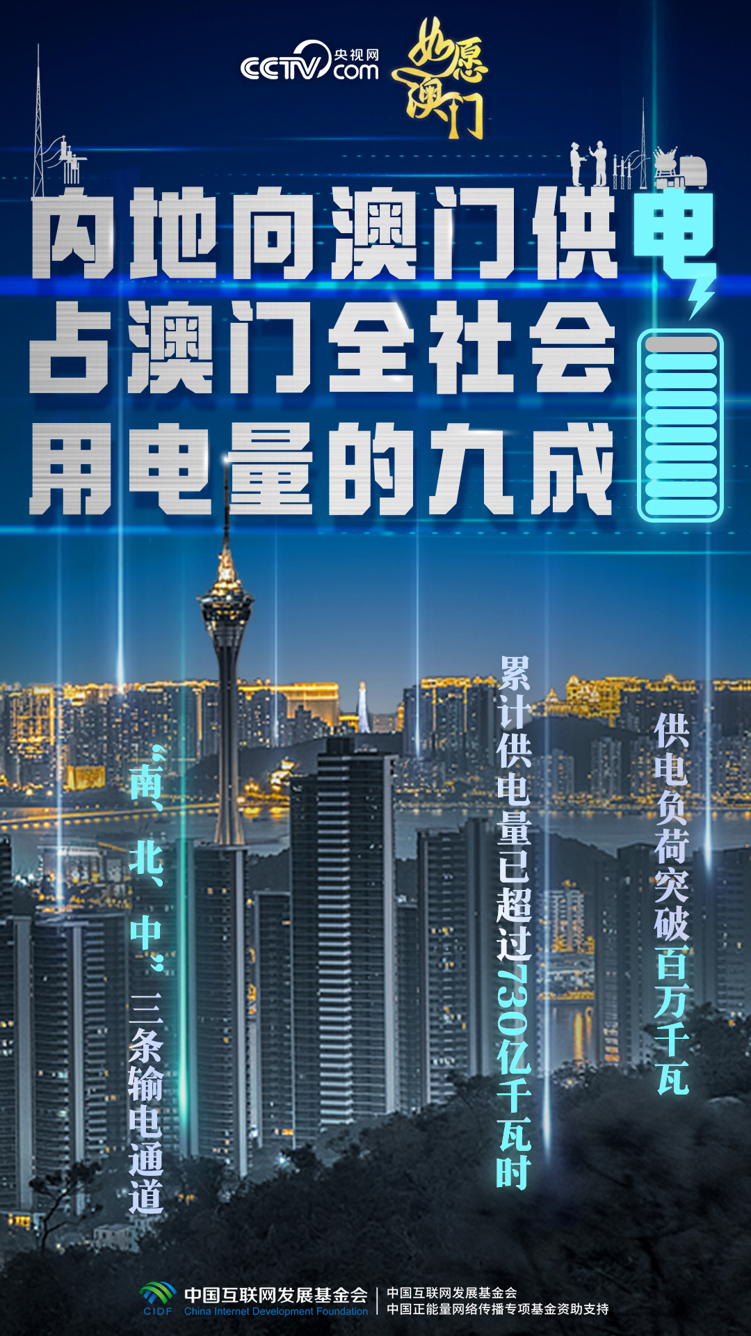 澳門(mén)缺電,南海油氣田里伸出專(zhuān)供澳門(mén)發(fā)電的天然氣管道,粵澳“南、北、中”三條輸電通道接續(xù)架設(shè),條條“銀線(xiàn)”相連,為澳門(mén)經(jīng)濟(jì)社會(huì)發(fā)展注入源源不斷的強(qiáng)勁動(dòng)能。1999年回歸當(dāng)年,內(nèi)地對(duì)澳供電量為1.95億千瓦時(shí);2024年7月,內(nèi)地向澳門(mén)供電負(fù)荷突破百萬(wàn)千瓦,累計(jì)供電量已超過(guò)730億千瓦時(shí)。