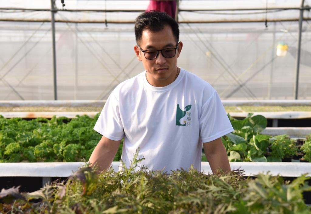 在珠海市金灣區(qū)紅旗鎮(zhèn)的一處農場,翠綠的菜葉盡情伸展,工人們正利用流水線快速采摘成熟的蔬菜。澳門青年孫振鴻和合作伙伴穿著雨靴在大棚中忙碌。