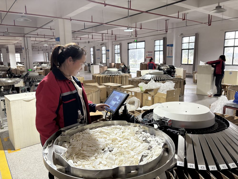在貴州亞獅龍產(chǎn)業(yè)園,工人正在操作羽毛球毛片彎拱分選機(jī)。新華社記者 李凡 攝