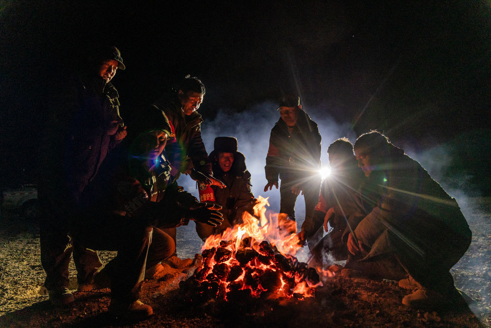 2024年5月10日,在羌塘國(guó)家級(jí)自然保護(hù)區(qū)核心區(qū)域,野生動(dòng)物專(zhuān)業(yè)管護(hù)隊(duì)員在宿營(yíng)地里烤火,燃料是野牦牛的糞便。羌塘國(guó)家級(jí)自然保護(hù)區(qū)位于西藏自治區(qū)北部,這里的管護(hù)隊(duì)員常年頂風(fēng)冒雪,穿越無(wú)人區(qū)進(jìn)行巡護(hù)。