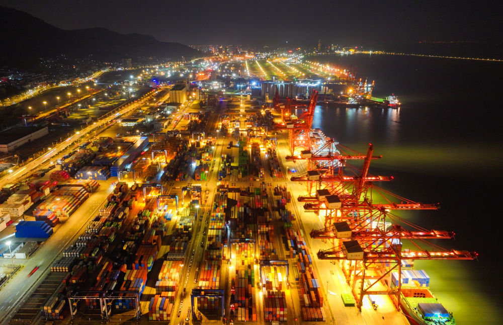 當日,夜幕下的江蘇連云港港集裝箱碼頭燈火明亮,工作人員繁忙有序地進行裝卸工作。臨近年末,江蘇連云港港持續(xù)提升港口集疏運水平,多措并舉加快貨物裝卸轉(zhuǎn)運效率,力爭外貿(mào)集裝箱吞吐量與出口量再創(chuàng)新高。