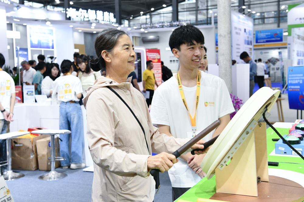 10月27日,老人在2024深圳國際智慧養(yǎng)老產(chǎn)業(yè)博覽會上體驗樂齡鼓。(新華社記者 梁旭 攝)