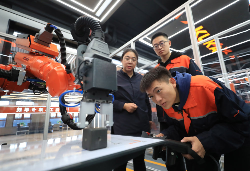 產(chǎn)教融合促就業(yè)。11月22日,沈陽工學院電氣工程及自動化專業(yè)學生操作機器人進行物料碼垛實訓。(新華社記者楊青攝)