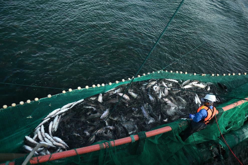 “傳統(tǒng)吊網(wǎng)捕撈會(huì)讓虹鱒魚(yú)體內(nèi)因緊張產(chǎn)生更多肌酸。我們現(xiàn)在用吸魚(yú)泵連魚(yú)帶水直接送入車間,保證魚(yú)肉質(zhì)鮮嫩?!彼f(shuō)。