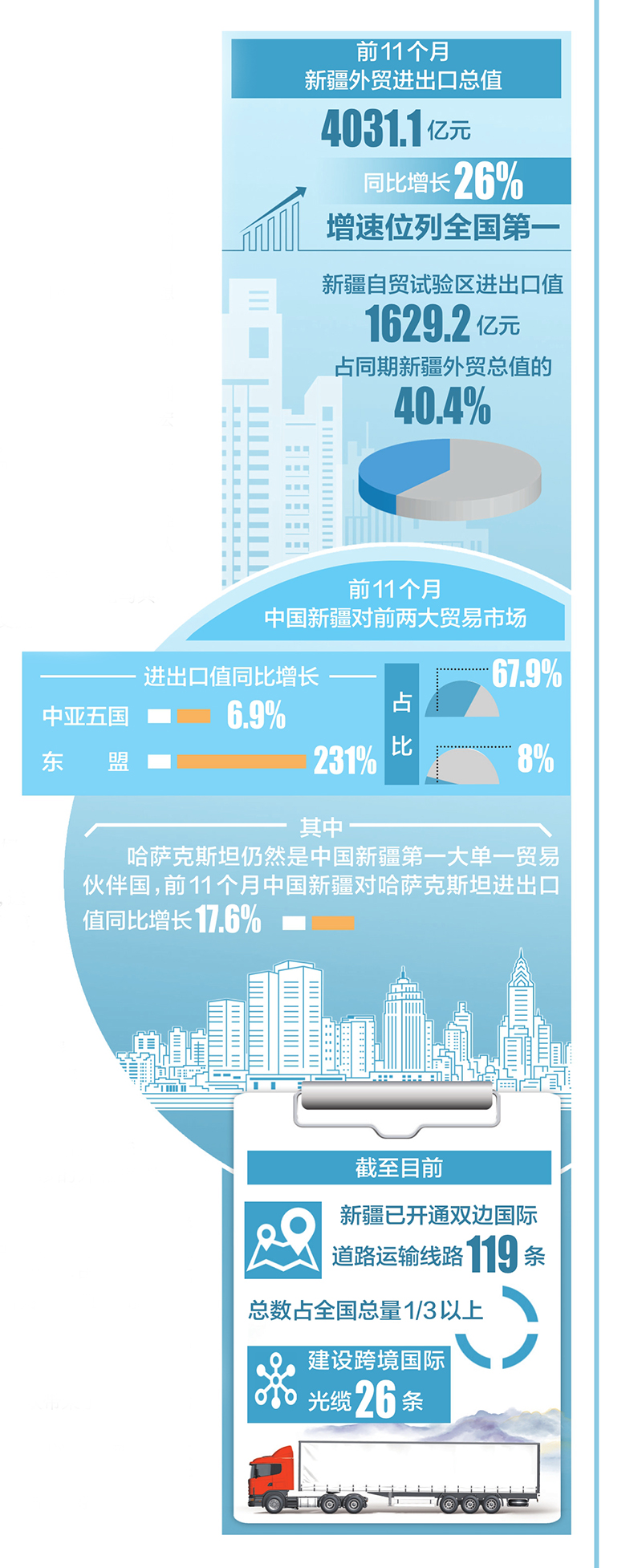 新疆自貿試驗區(qū)賦能效應持續(xù)顯現。烏魯木齊海關數據顯示,前11個月,新疆自貿試驗區(qū)進出口值1629.2億元,占同期新疆外貿總值的40.4%。