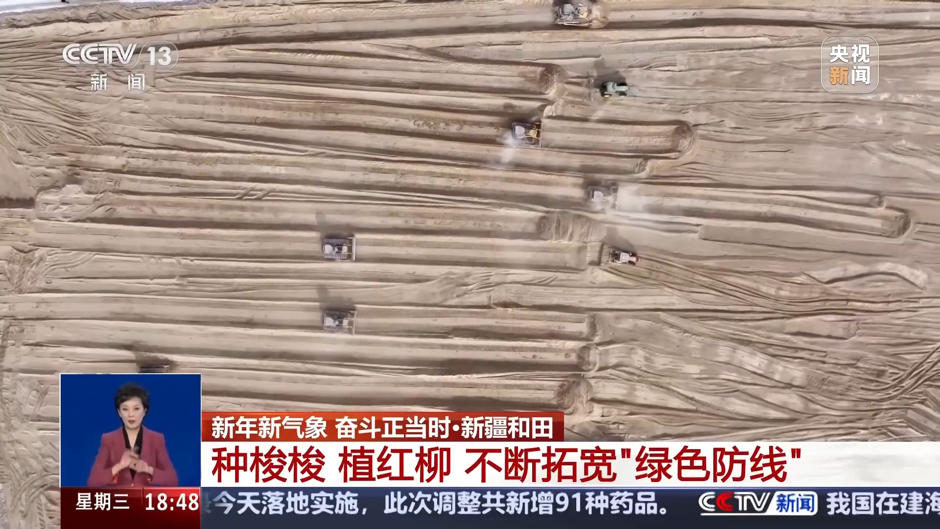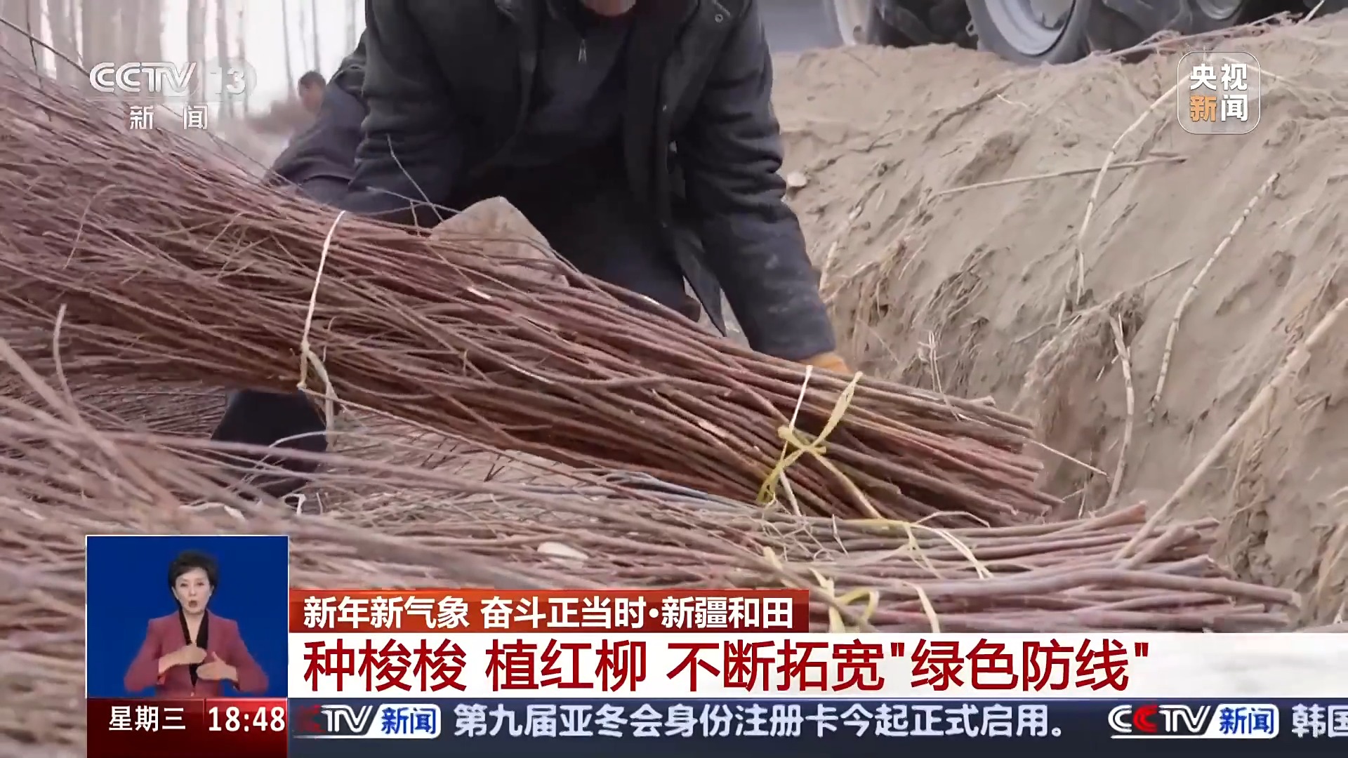 總臺記者 高鵬飛:這里是塔克拉瑪干沙漠南緣的和田于田縣,這兩天沙漠里面迎來了一場降雪,這會氣溫在零下10℃左右,非常寒冷,但是,在我旁邊就是一處熱火朝天的沙漠治沙現(xiàn)場。