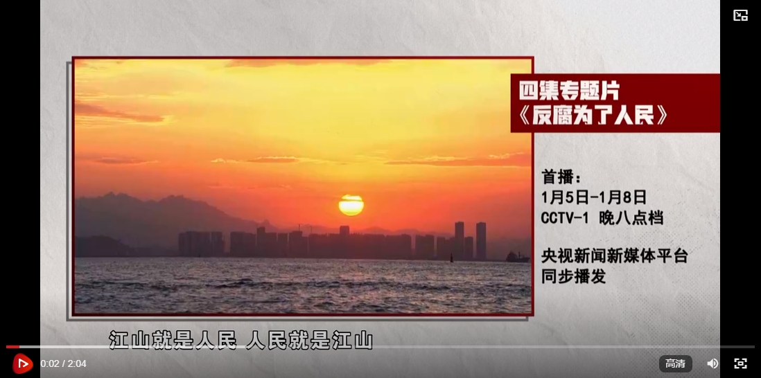 由中央紀(jì)委國家監(jiān)委宣傳部與中央廣播電視總臺(tái)聯(lián)合攝制的四集電視專題片《反腐 為了人民》,將于1月5日至8日在中央廣播電視總臺(tái)央視綜合頻道晚8點(diǎn)檔播出。