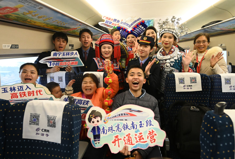 2024年12月30日,工作人員和乘客在廣西玉林開(kāi)往南寧的列車(chē)上合影。