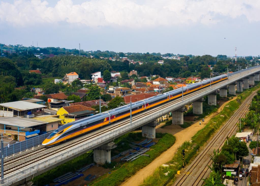 這是2023年5月22日拍攝的行駛在印度尼西亞雅萬(wàn)高鐵沿線的雅萬(wàn)高鐵綜合檢測(cè)列車(chē)(無(wú)人機(jī)照片)。新華社發(fā)(中國(guó)鐵路國(guó)際有限公司供圖)