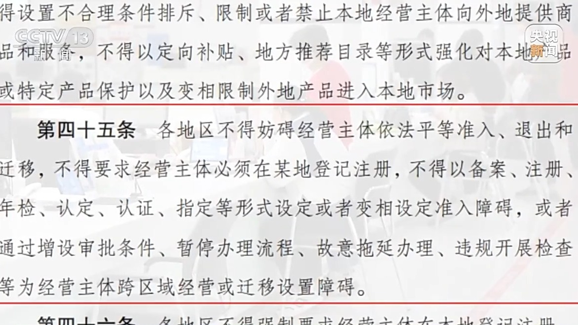 白巖松:構(gòu)建全國統(tǒng)一大市場點多面廣、千頭萬緒,但概括來說,要破立并舉、先立后破。要“立”的是統(tǒng)一的政策、規(guī)則和標(biāo)準(zhǔn)。而要“破”的,則是妨礙統(tǒng)一市場和公平競爭的各種規(guī)定和做法,尤其是地方保護(hù)和市場分割。為此,發(fā)改委《指引》中強(qiáng)調(diào)了若干個“不得”,各地不得限制商品和要素跨區(qū)域自由流動,不得妨礙經(jīng)營主體依法平等準(zhǔn)入、退出和遷移,也不得違法開展異地執(zhí)法或?qū)嵭挟惖毓茌牭取_@相當(dāng)于給地方政府劃出了不能碰的“底線紅線”,一旦觸碰,就得承擔(dān)相應(yīng)責(zé)任。有了這些“底線紅線”,阻礙大市場的“籬笆墻”能打破嗎?
