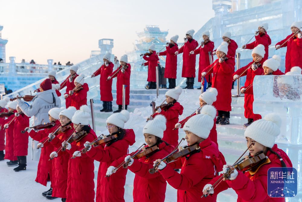 當(dāng)日,哈爾濱冰雪大世界園區(qū)上演音樂“快閃”,為即將到來的亞冬會助力。