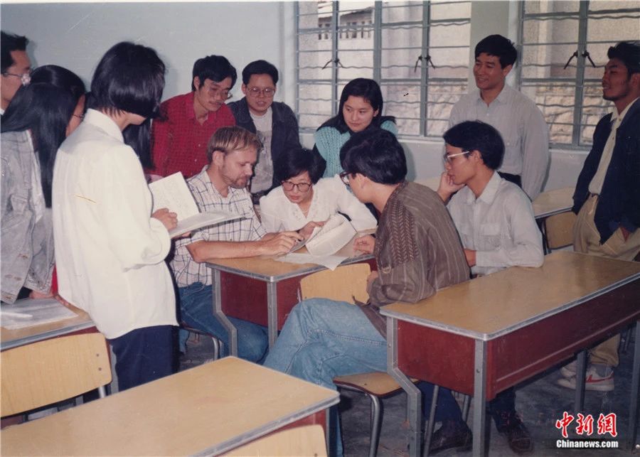 20世紀(jì)80年代末,潘維廉在廈門(mén)大學(xué)的課堂上與學(xué)生交流。受訪者供圖