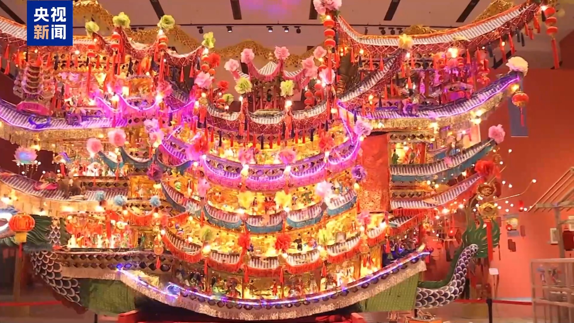 進(jìn)入彩門(mén)樓,寫(xiě)春聯(lián)、印年畫(huà)、投壺等傳統(tǒng)年俗,讓濃濃的年味兒撲面而來(lái),熱鬧的鄉(xiāng)村大舞臺(tái)、流光溢彩的花燈讓人目不暇接。其中來(lái)自浙江樂(lè)清的首飾龍,是館內(nèi)單體最大的花燈,春節(jié)期間,當(dāng)?shù)匕傩諘?huì)抬著“首飾龍”游街串巷,承載著為家家戶(hù)戶(hù)祈求平安的美好寓意。