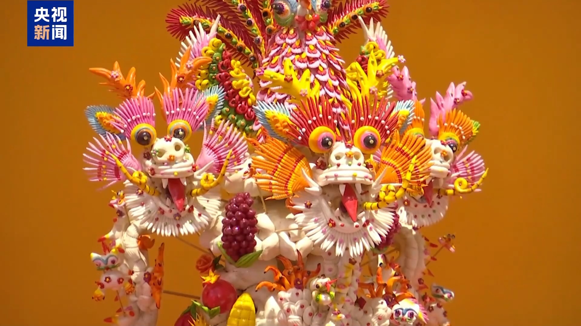 由地方非遺傳承人制作,傳統(tǒng)與創(chuàng)新兼具的面花作品《龍鳳棗山》,用搓、揉、編等10多道工序結(jié)合制作而成,吸引了不少觀(guān)眾駐足觀(guān)看。