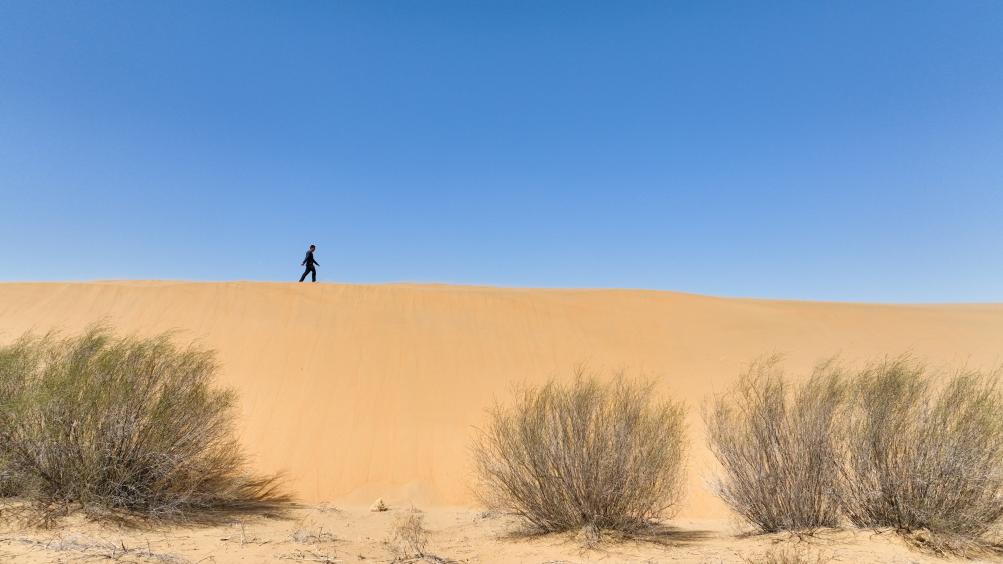 2024年4月11日,一名治沙人行走在達(dá)拉特旗境內(nèi)的庫(kù)布其沙漠里(無(wú)人機(jī)照片)。新華社記者 貝赫 攝