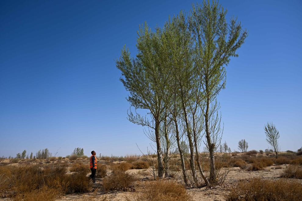2024年4月11日,一名治沙人在達(dá)拉特旗境內(nèi)的庫(kù)布其沙漠里巡護(hù)樹木。新華社記者 李志鵬 攝