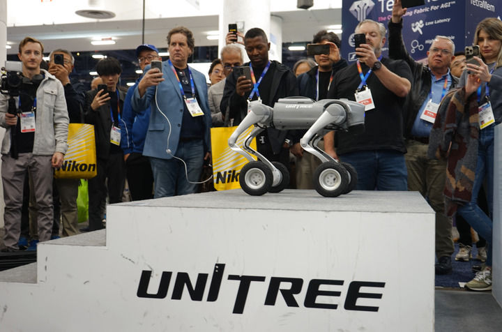 2025年1月8日,在2025年美國拉斯維加斯消費電子展(CES)上,人們在中國企業(yè)宇樹科技的展區(qū)觀看機器狗展示。新華社發(fā)(曾慧攝)