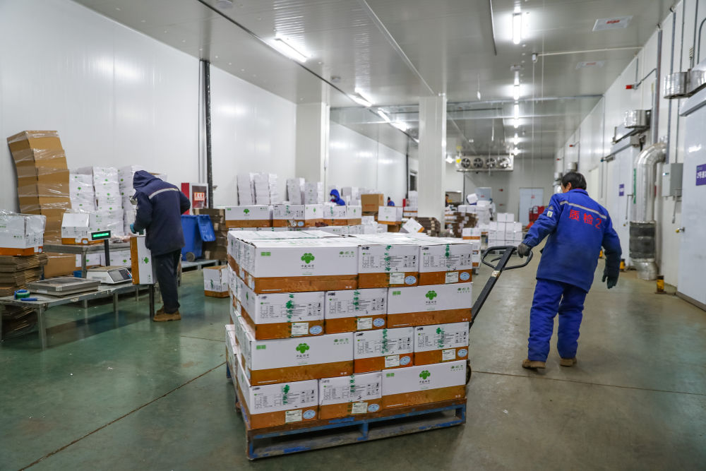 1月8日,在環(huán)縣中盛羊業(yè)加工車間,工作人員轉(zhuǎn)運羊肉準備發(fā)貨。 新華社記者郎兵兵 攝