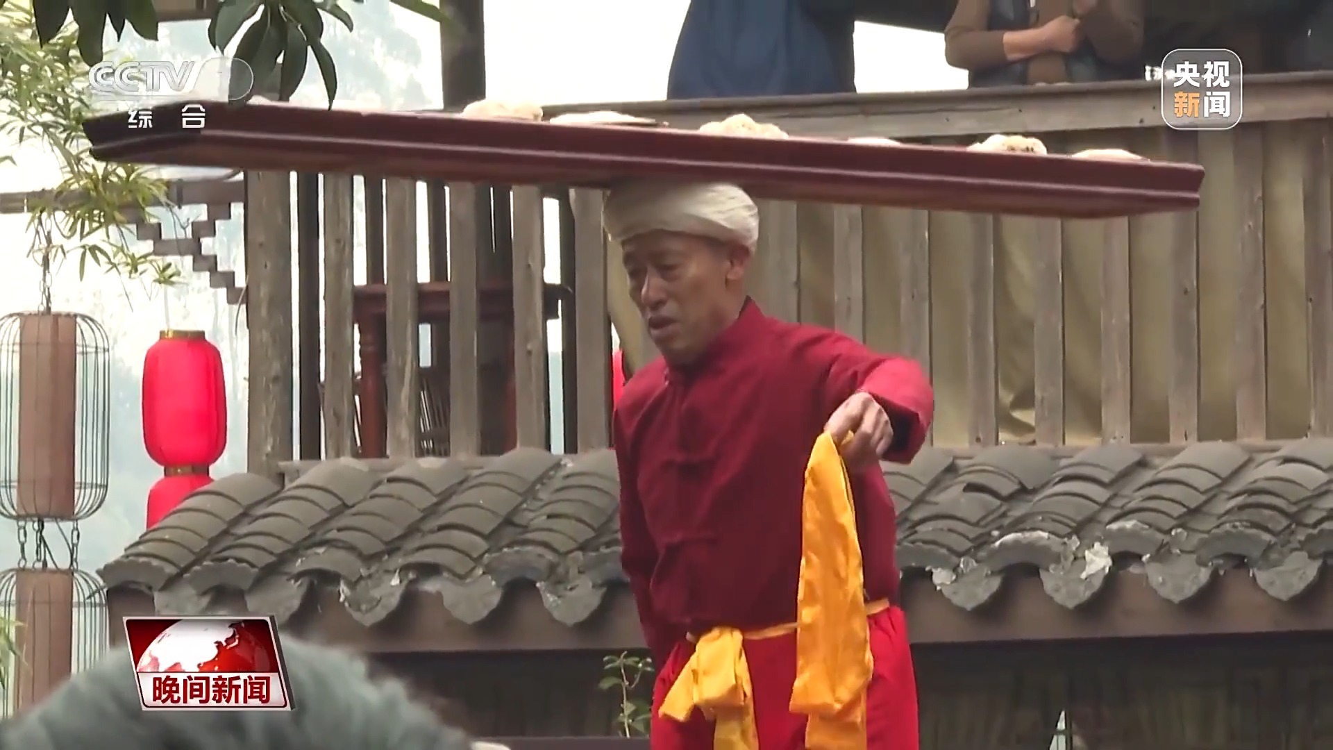 古鎮(zhèn)街道狹長(zhǎng),辦宴席時(shí)需要快速傳菜,于是便有了“打盆”這種獨(dú)特的上菜方式。在我們的左手邊,就有一位當(dāng)?shù)乩先苏诒硌荽蚺杞^技。