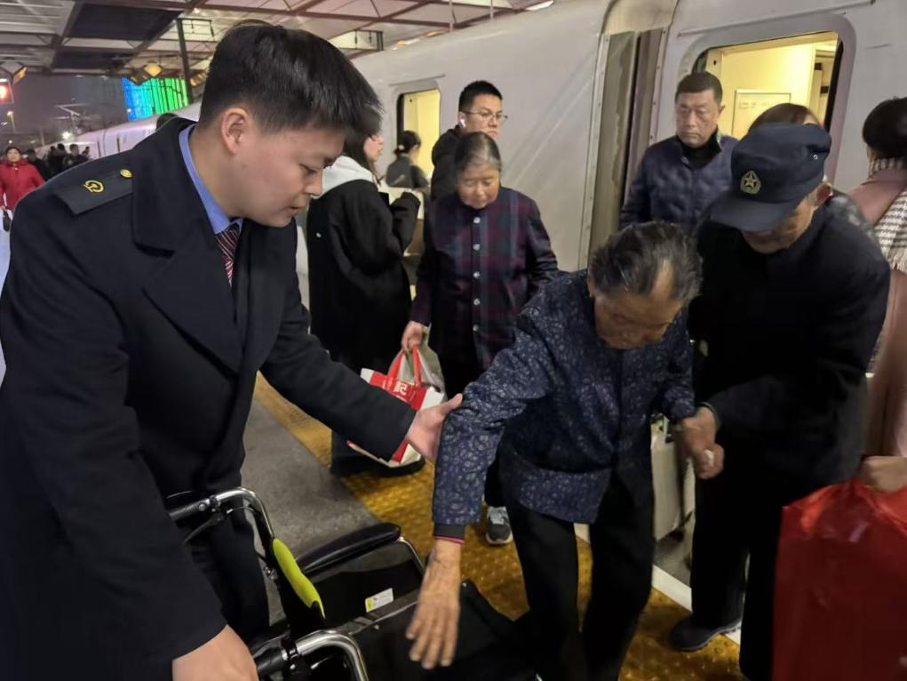 圖為1月18日,蘇州站鐵路工作人員為進(jìn)城高齡老人提供暖心到站接車服務(wù)。新華社發(fā) 馬驍攝